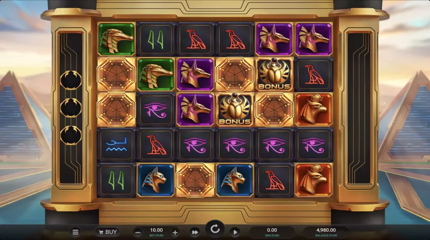 Le plateau de jeu, un quadrillage doré de 6x5, promet jusqu’à 15,625 façons de gagner, avec des rangées de symboles néon d’inspiration égyptienne s'ornant de chats, de crocodiles, de chacals, d'oiseaux et du pharaon, culminant en une expérience visuelle tout aussi captivante que la mécanique du jeu.