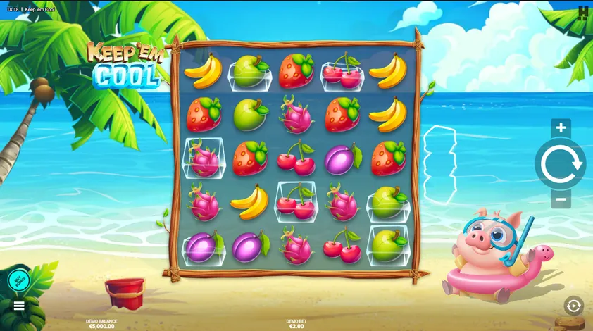Le décor de Keep 'Em Cool vous transporte sur une plage paradisiaque, avec ses eaux turquoises, ses sables dorés et son ciel bleu azur. Bien que le design soit assez simple, l'ajout d'un personnage inattendu - un cochon en tenue de plongée - apporte une note de personnalité amusante à l'ensemble.